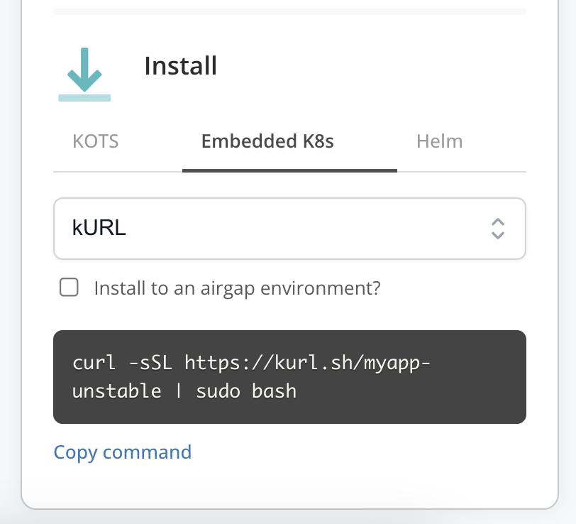In the dropdown, choose kURL or Embedded Cluster to view the command for the target installer: